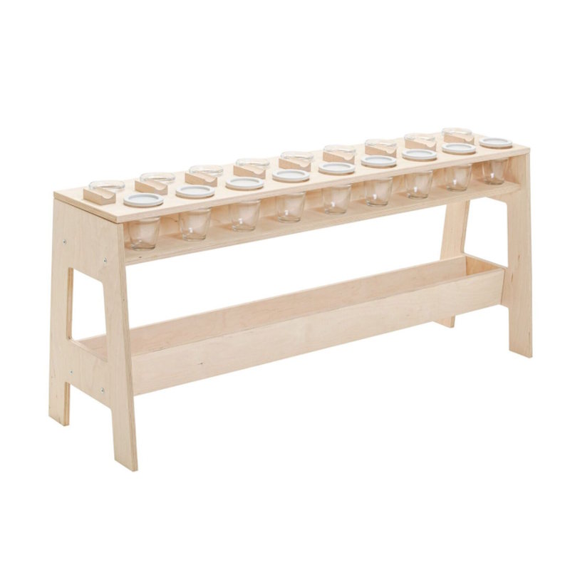 Der Farbpalettentisch bildet das Zentrum eines Malraumes, bei dem sich kleine und große Malbegeisterte treffen, um sich ganz dem Malen zu widmen. Die festgelegte Reihenfolge und Struktur der Farben unterstützt den Malprozess durch den zuverlässigen haltgebenden Rahmen. Zudem wird die Gruppendynamik im sozialen Umgang miteinander gefördert. Der praktisch konzipierte Gruppenmaltisch bietet Platz für Farbschälchen, Wasserbecher und Pinsel. Außerdem befindet sich unter der Tischoberfläche ein Ablagefach für weitere Utensilien. Der Farbvorrat lässt sich bequem in einem Fach unter dem Tisch verstauen.